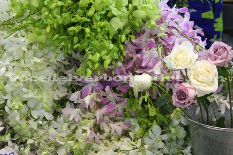Arriviamo nel tardo pomeriggio, quando i fornitori stanno consegnando i fiori freschi. Resto per un attimo inebriata dall’insieme dei profumi che si diffonde nell’aria, resi ancora più forti dall’umidità che inzuppa Bangkok.