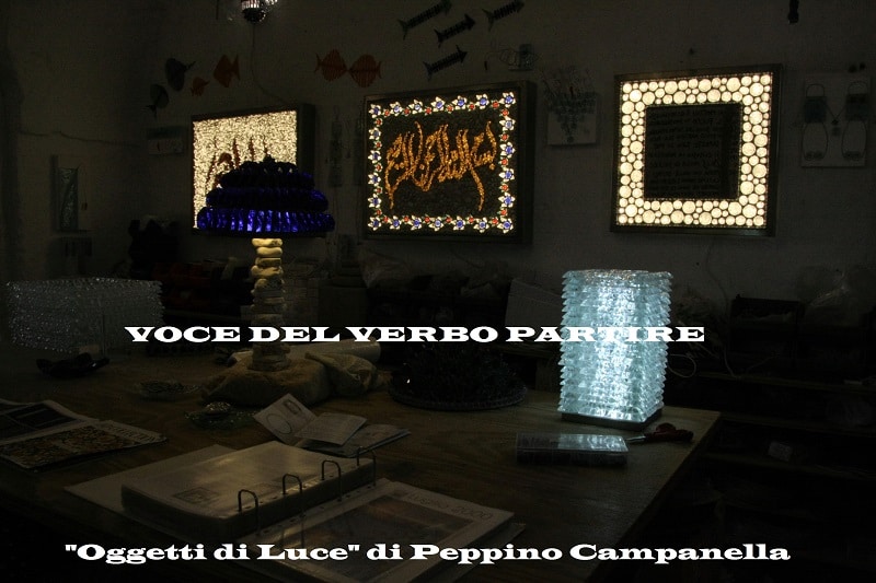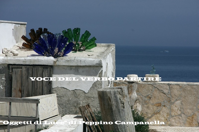 A poche centinaia di metri dal monumento a Modugno, in Via Coversano, Maria ci fa entrare in un laboratorio artigianale. Peppino Campanella ci accoglie con grande cortesia nel suo atelier ricco di opere d’arte, permettendoci anche di fotografare i capolavori che crea, lasciandosi guidare da una sensibilità unica. “Oggetti di Luce” rappresenta in pieno la sua poetica, una produzione che si ispira alla magnificenza di Polignano.