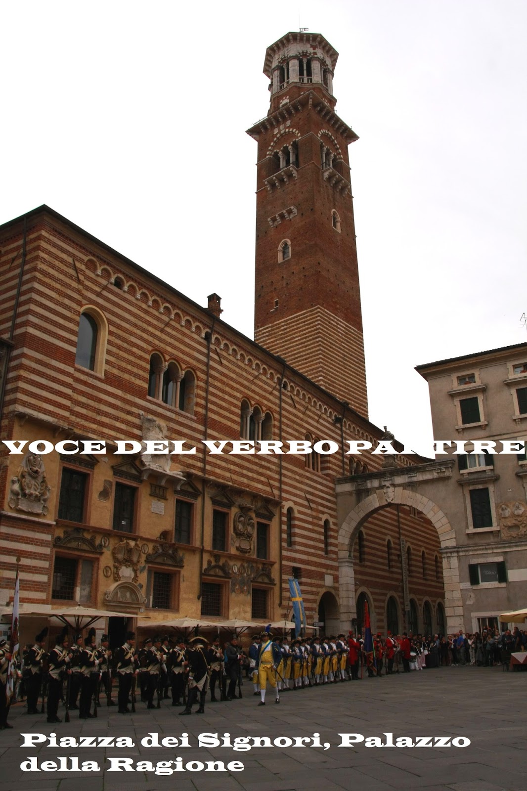 Quando arriviamo in quello che era l’antico foro romano, ossia la bellissima Piazza Erbe, nemmeno il brutto tempo può cavarci un’espressione stupita dal volto. D’accordo, è piena di visitatori, oltre che di personaggi in costume, impegnati in una rievocazione storica, ma la stupefacente quinta architettonica che si presenta ai nostri occhi, è di una eleganza incredibile.