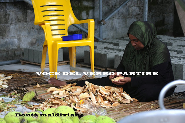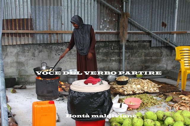 Non mancano anziani isolani, che si fermano a chiacchierare con noi, felici di mostrarci un grosso carico di foglie di curry. Profumatissime e fresche. Scopriamo che i maldiviani sono davvero felici di condividere con gli stranieri le loro usanze. Così come i loro cibi: non di rado si incontrano donne che cucinano grosse quantità di cibo all’aperto, nei cortili o lungo le strade, per sfamare le immense famiglie o addirittura da spedire ai parenti di Male, che offrono con piacere ai turisti le loro prelibatezze. Io consiglio di assaggiare tutto senza timore!