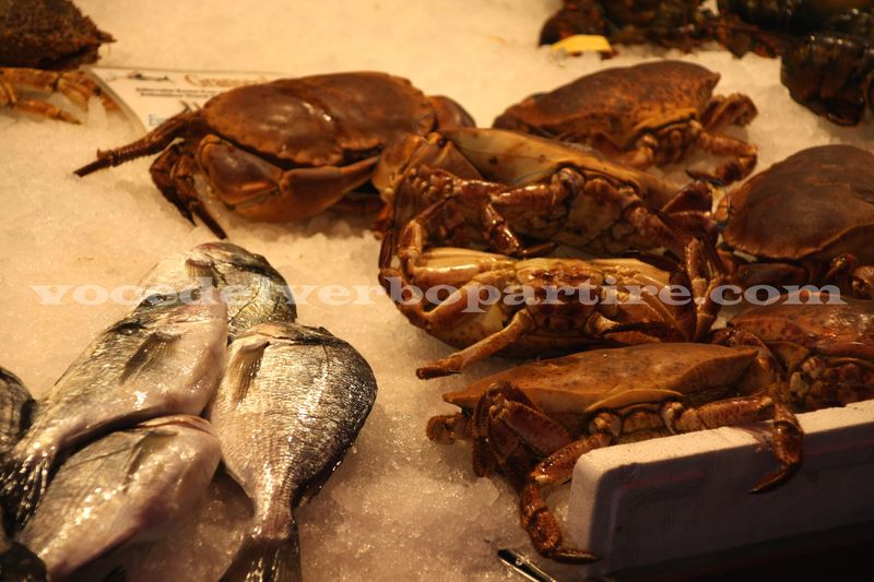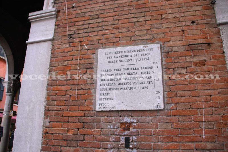 Passeggiamo anche tra i portici del Mercato Coperto dove, un pannello, mostra la giusta dimensione del pesce, per poter essere venduto.