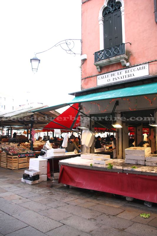 Come parte di questo tessuto urbano, io e Daniele ci lasciamo tentare dagli scorci e, proprio mentre mi soffermo a fare una fotografia, scorgo delle bancarelle che, appena ci intrufoliamo nell’allegro Campo Della Pescaria, a pochi passi dal Ponte di Rialto, si trasformano in un coloratissimo mercato di frutta, verdura, spezie, fiori e pesce!