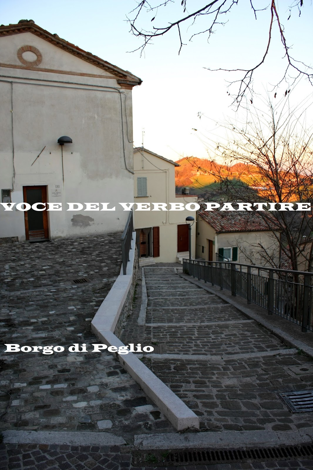 In un’ora di strada raggiungiamo la nostra meta, accompagnati da uno splendido panorama e dai vivaci giochi di luce, che si inseguono nella vallata; iniziamo le visite dalla più piccola delle due località, Peglio, affacciato sull’Alta Valle del fiume Metauro.