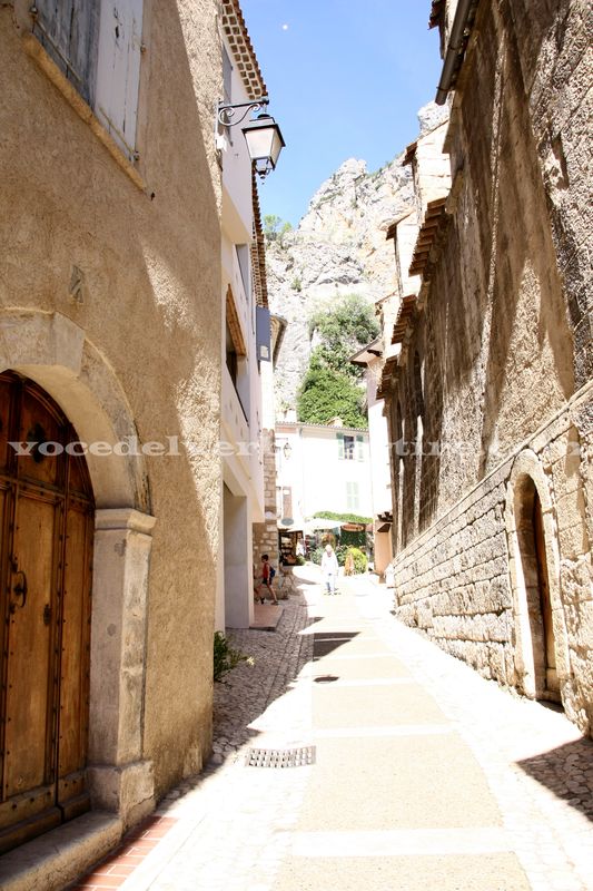 Lentezza e piacere per gli occhi, questo è Moustiers. Non c’è nulla per cui si debba correre, se non per cercare un momento di refrigerio sotto ai grossi alberi, che invadono i piccoli slarghi con la loro mole. Mi sono sempre chiesta come mai, queste bellissime piante, fossero tanto imponenti. Forse, istintivamente, la natura cerca di proteggere l’uomo dalla calura del sole estivo! Ci fermiamo qui, ad ascoltare il canto delle cicale, mentre attorno noi la vita scorre al rallentatore.
