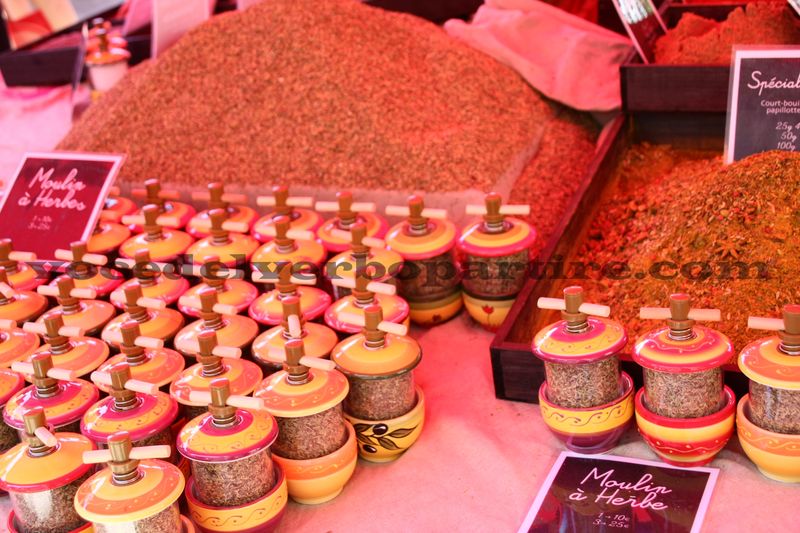 In Cours Mirabeau, abiti, tovaglie, stoffe, borse di paglia, vengono esposti in vivaci bancarelle e spiccano sulle coperture bianche. E’ una successione infinita, che sfocia nel mercato della frutta, verdura e generi alimentari.