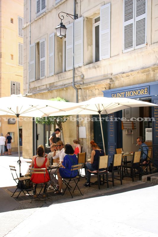 Beviamo un caffè in una piccola cioccolateria, passeggiamo senza meta, mangiamo una quiche e ci sediamo in un cafè, per riposarci all’ombra della composizione di tendoni ed ombrelloni, così tipicamente provenzale! Café e brasserie, sono praticamente ovunque. Anche il più piccolo negozietto o boulangerie, ha ricavato un minuscolo spazio esterno, per permettere ai clienti di consumare all’aria aperta qualcosa da bere o da mangiare.
