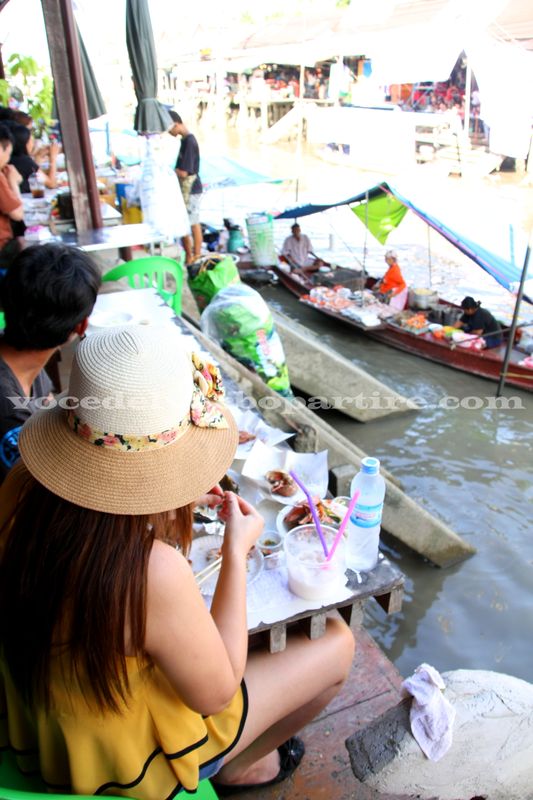 Pranziamo in un ristorantino, per assaggiare alcuni piatti a base di carne e pesce, dopodiché trascorriamo il resto del pomeriggio, bighellonando tra i banchetti del mercato, facendo foto e rilassandoci sulle panche disseminate lungo la riva. In tutta la giornata, incrociamo solo una decina di turisti. Per il resto siamo circondati da thailandesi, completamente assorbiti dal cibo, dagli acquisti e dalle visite. E noi con loro.