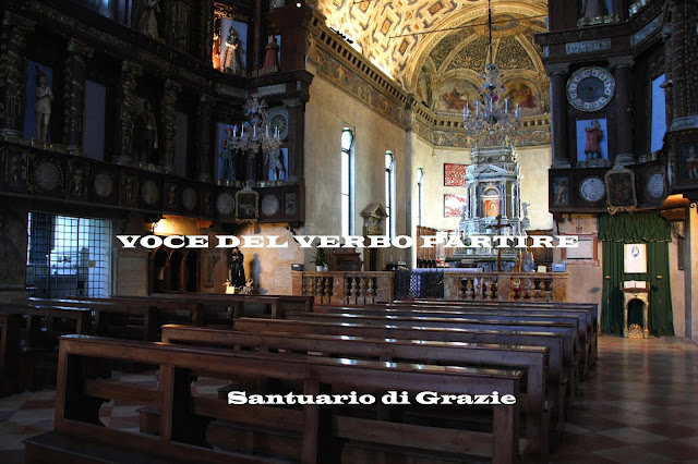 Per non parlare delle immagini aggettanti, presenti un po’ ovunque, che inizialmente scambio per conchiglie. Claudia illusa e stupidamente romantica: pensi di essere alle Seychelles? Si tratta in realtà di bubboni della peste, di seni, arti, occhi, che rappresentano ex-voto e richieste di miracoli, da parte dei credenti! La chiesa, in effetti, venne fatta edificare nel 1399 da Francesco Gonzaga, come ringraziamento alla Madonna per aver interrotto la terribile epidemia di peste, che stava falciando la popolazione. Il Santuario della Beata Vergine delle Grazie, ha caratteristiche prettamente pagane e numerose chiavi di lettura. Per contro, ha un intimo e delizioso chiostro, dallo stile molto più classico.